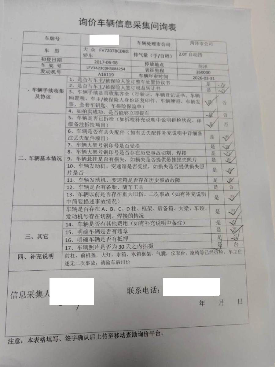车架号是否受损 未知 使用性质 非营运
