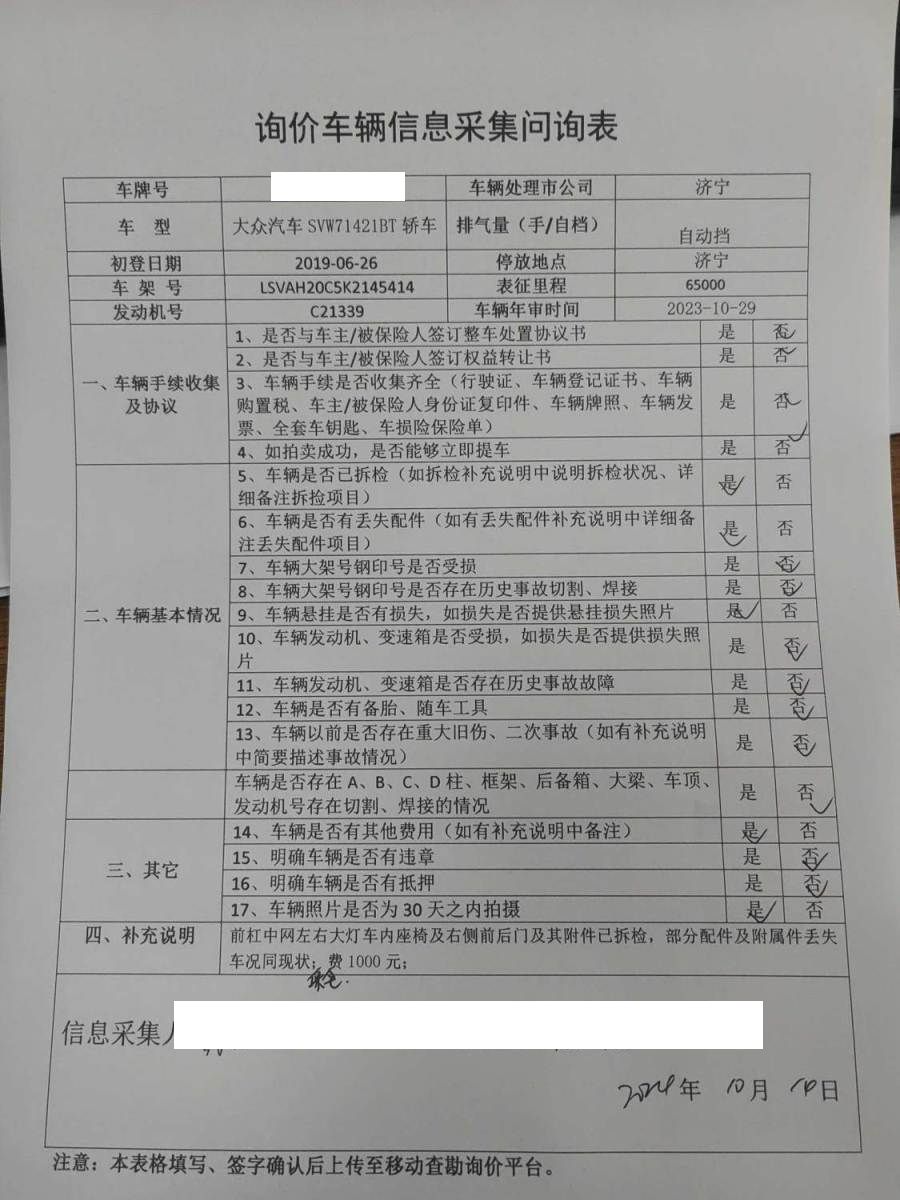 前杠中网左右大灯车内座椅及其右侧前后门及其附件已拆检,部分配件丢失车况同现状。确定全损后保全费元【二询备注:取消保全地费用,因询价周期较长发起二询,现车辆与询价车况时一致】 5年以上车辆报价后不得以二次事故为由提出议价或退车弃标。