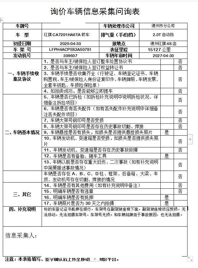 车架号是否受损 未知 使用性质 非营运