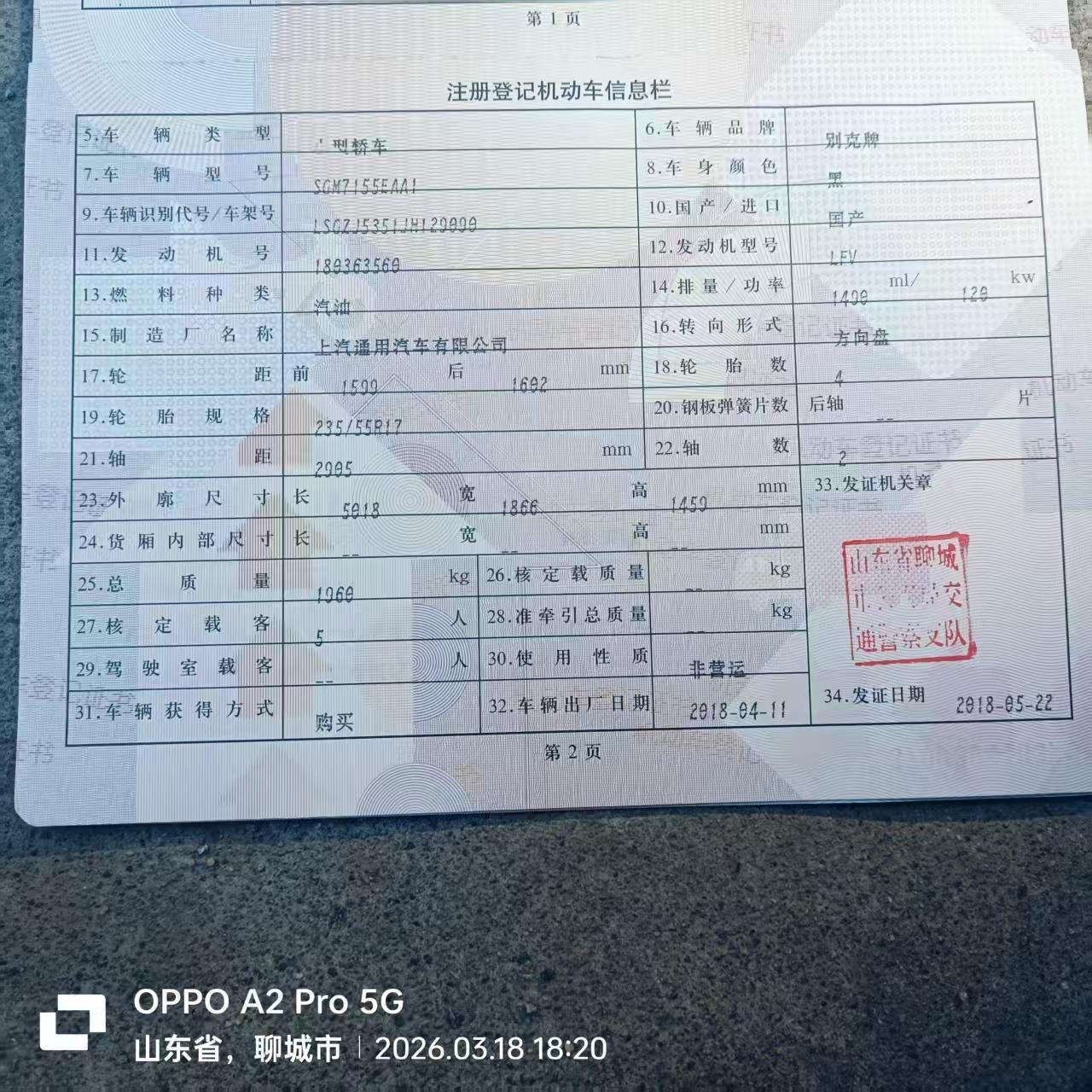 初次登记日期 2018-05-22 车辆名称 别克 君越