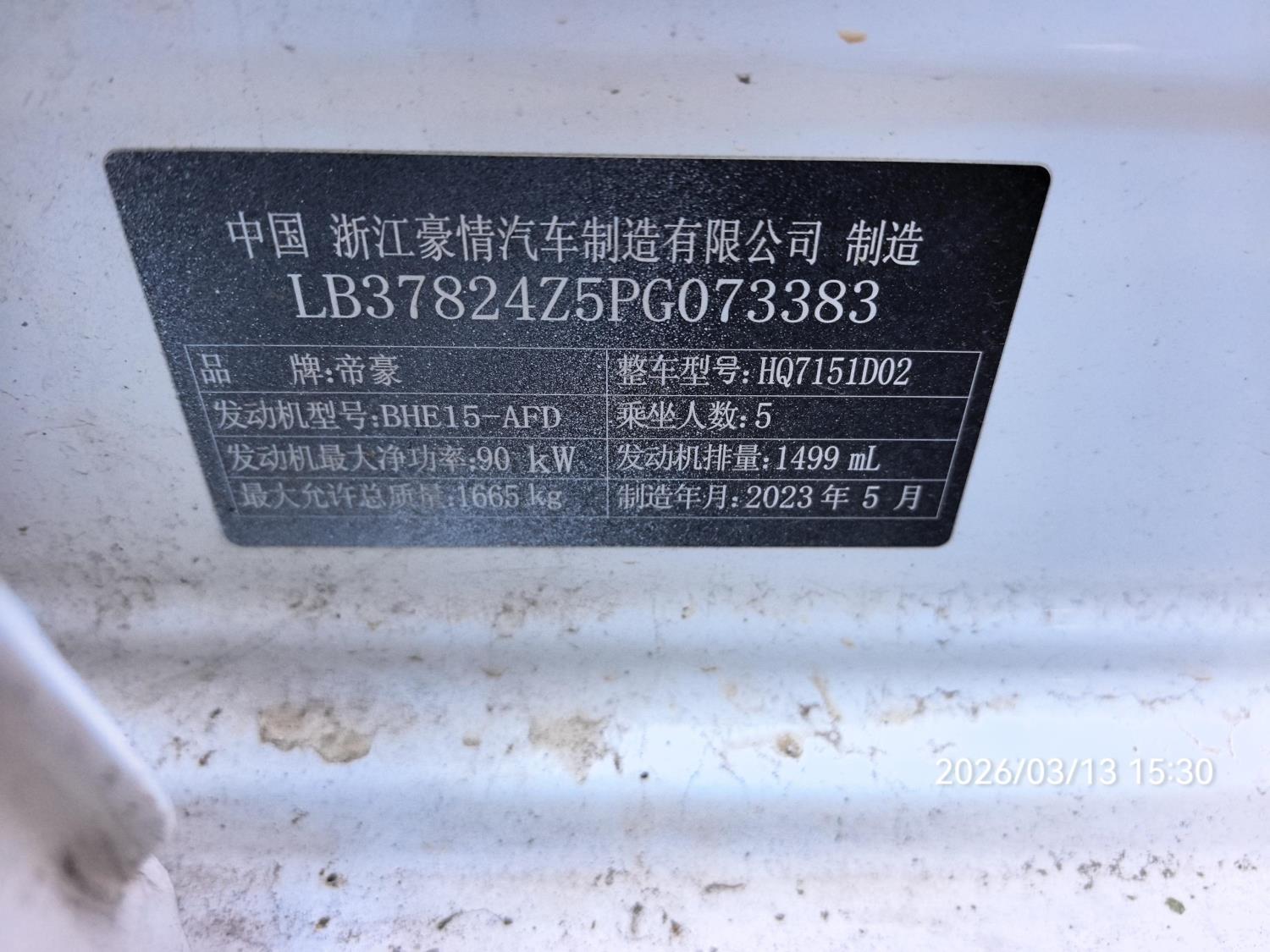 初次登记日期 2023-06-27 车辆名称 吉利汽车 帝豪