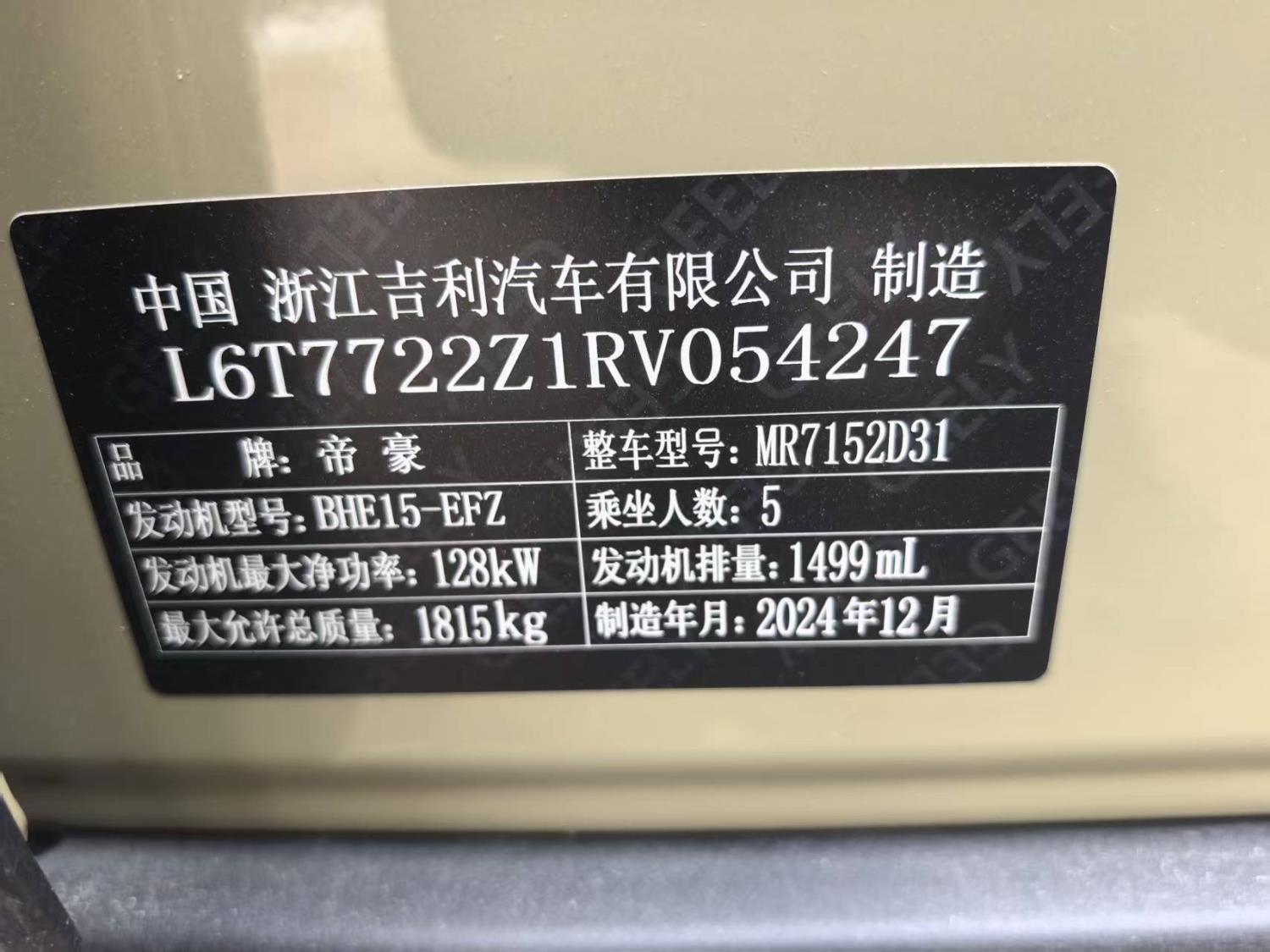初次登记日期 2024-12-16 车辆名称 吉利汽车 吉利ICON
