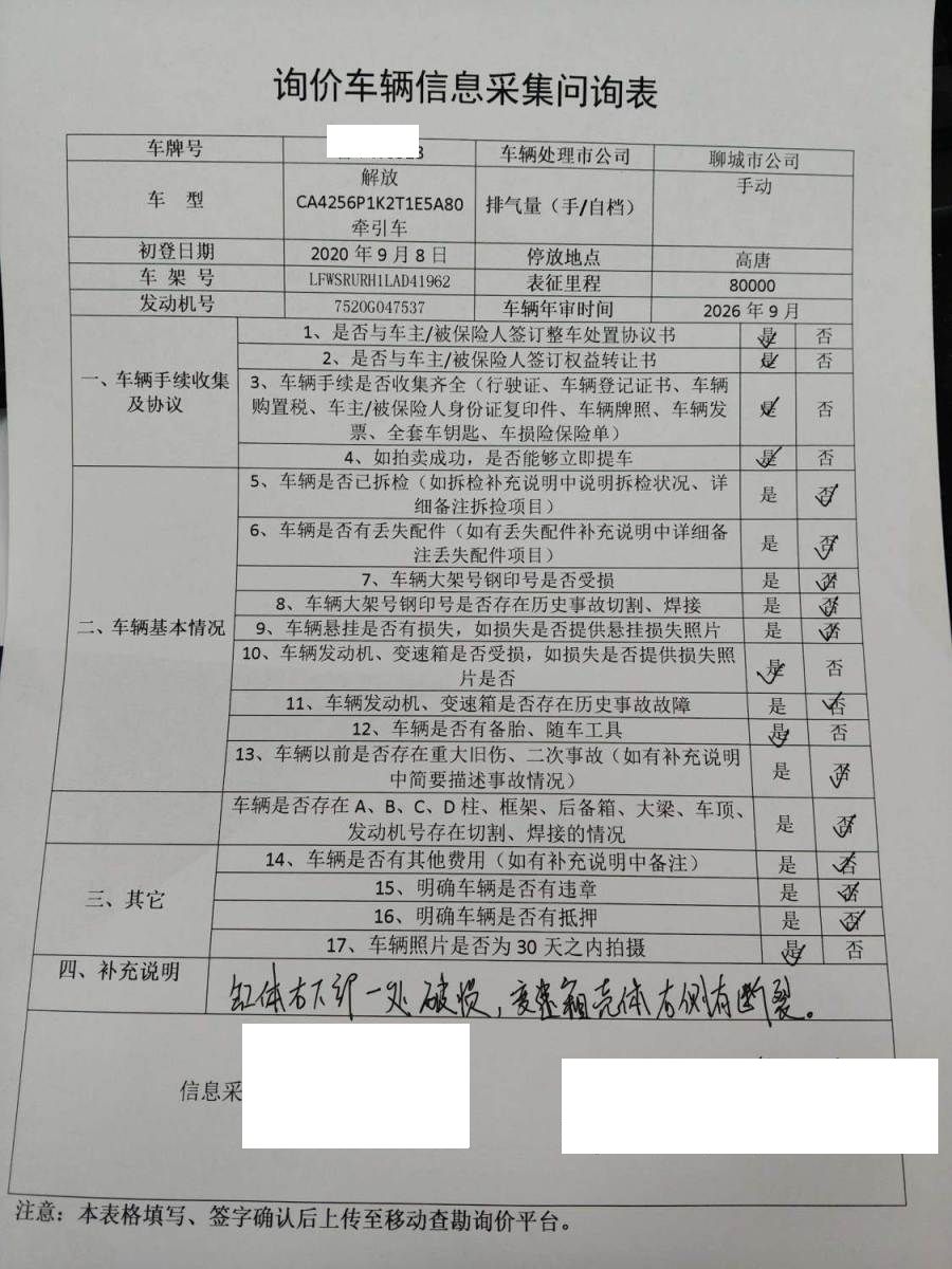 车架号是否受损 未知 使用性质 货运