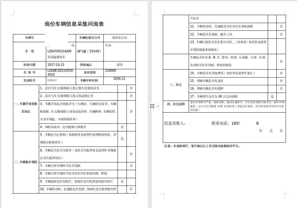 车架号是否受损 未知 使用性质 非营运