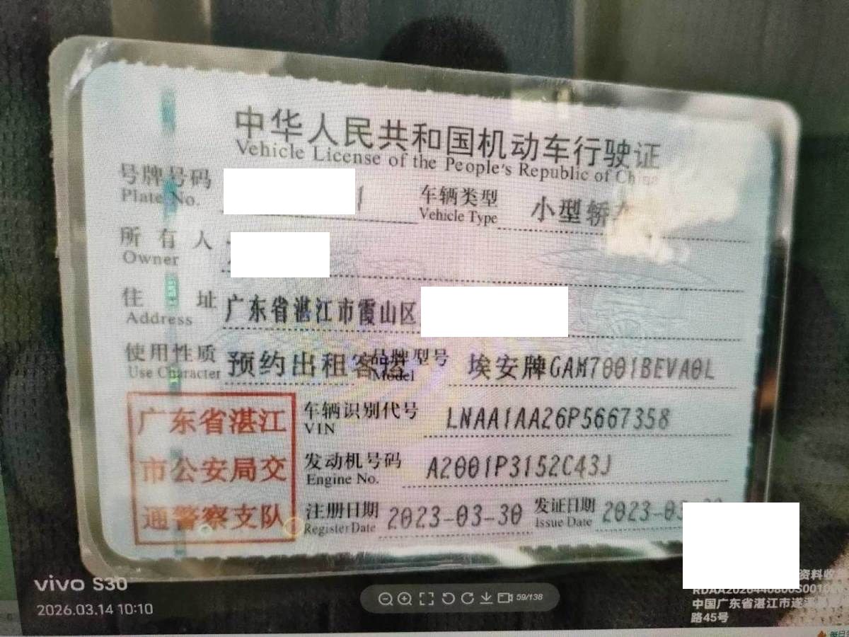 初次登记日期 2023-03-30 车辆名称 埃安 AION