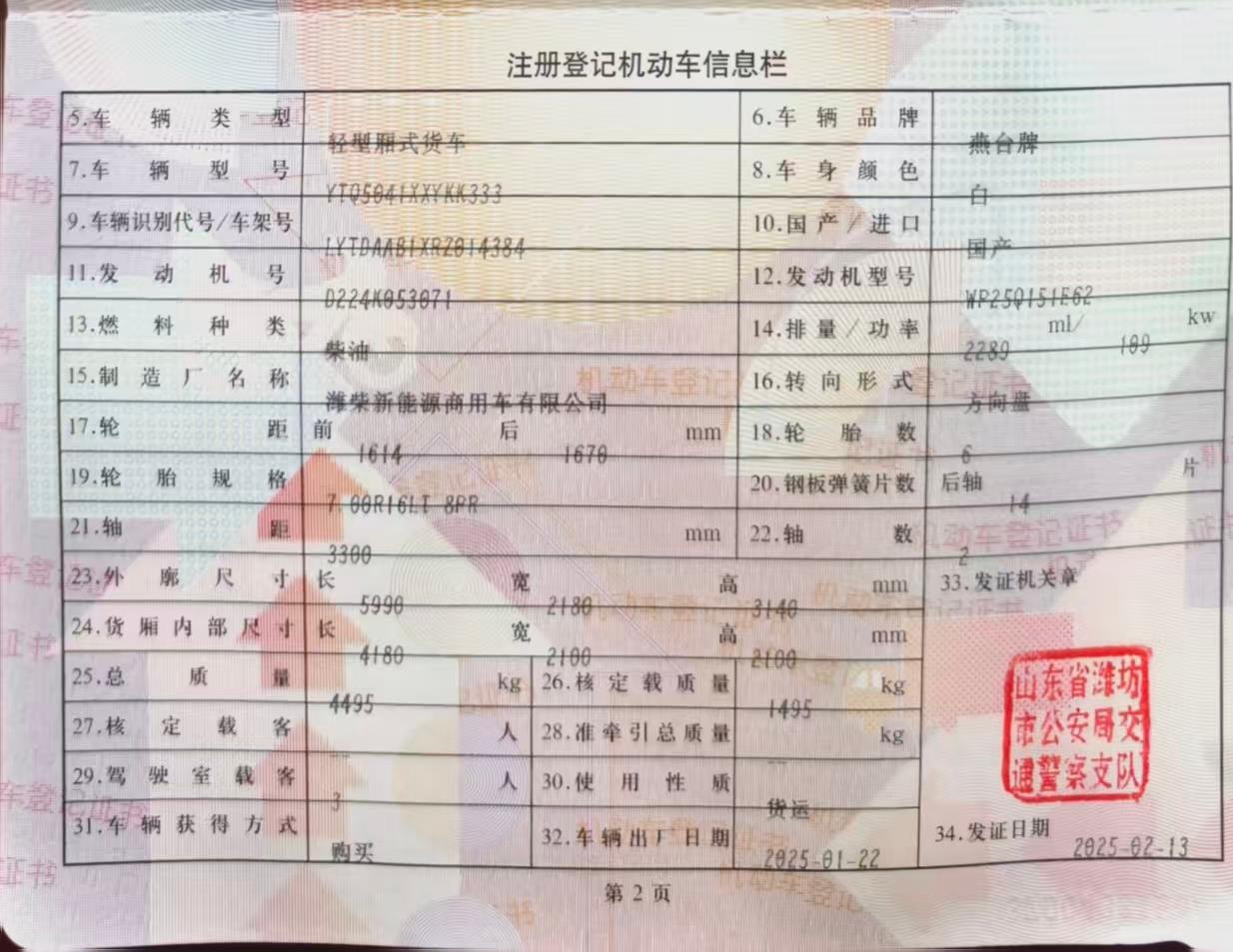 初次登记日期 2025-02-13 车辆名称 陕汽轻卡 德龙K3000