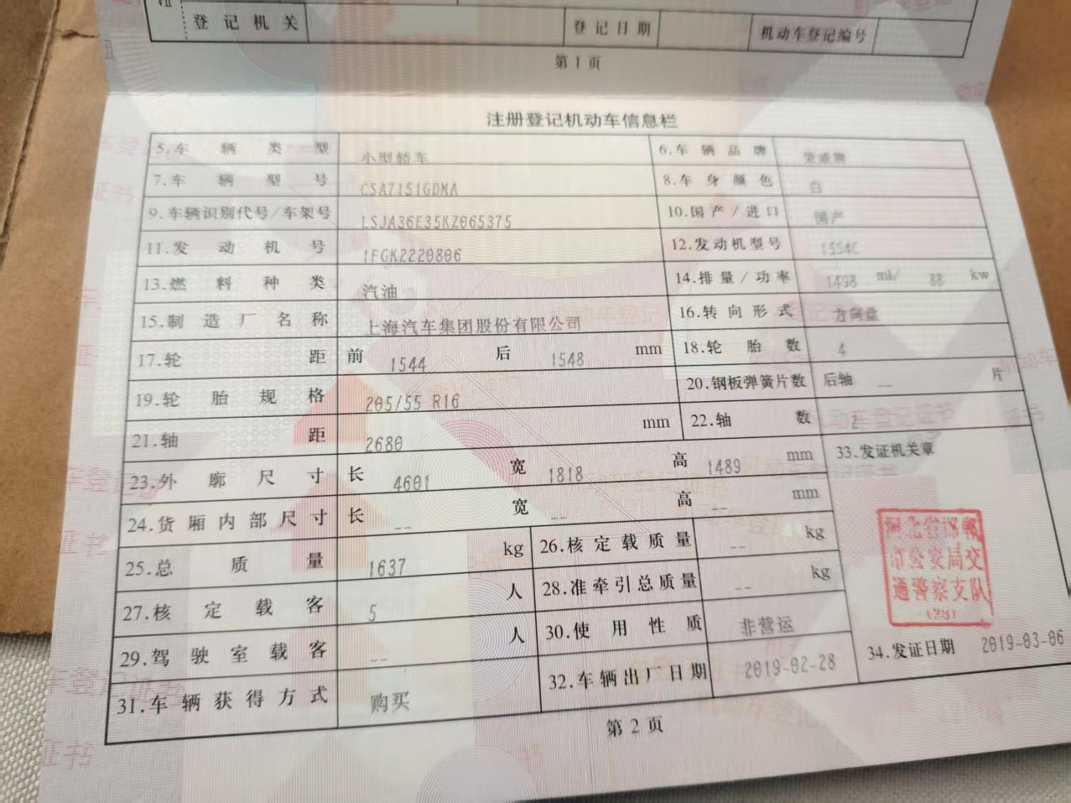 初次登记日期 2019-03-06 车辆名称 荣威i5