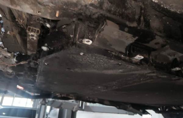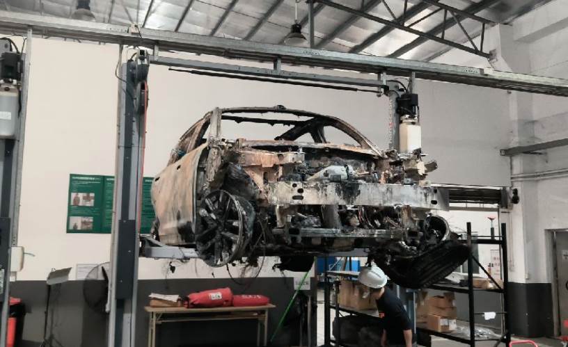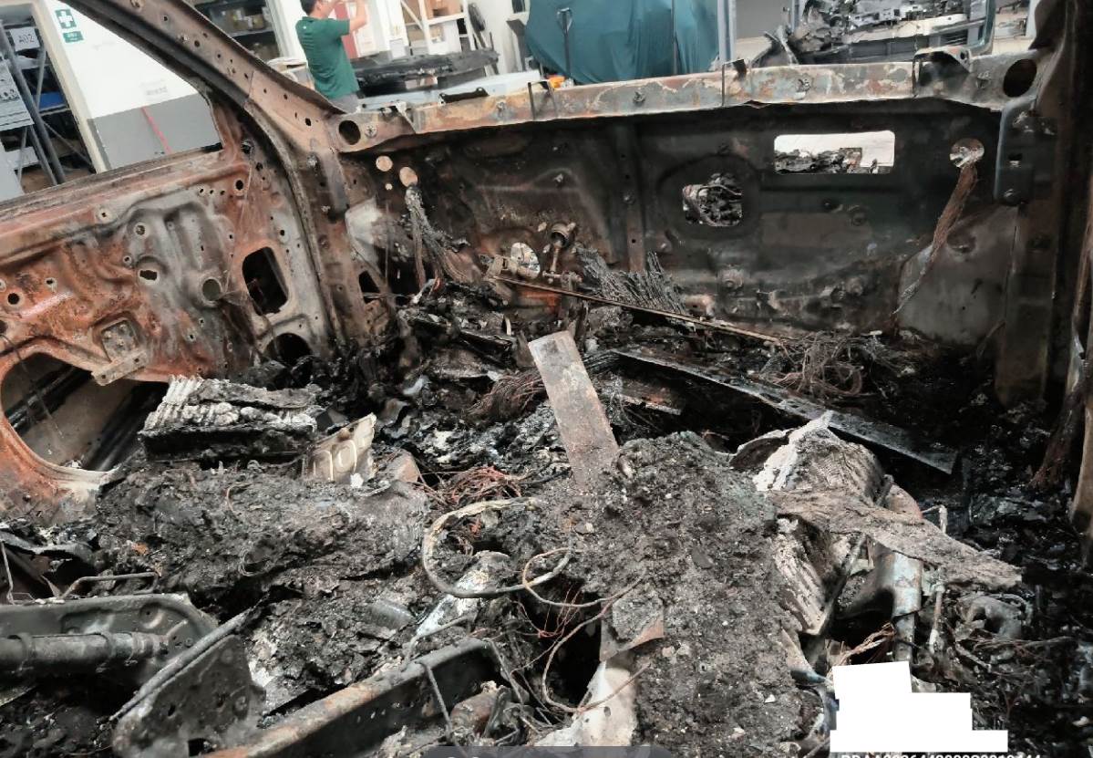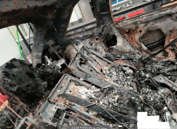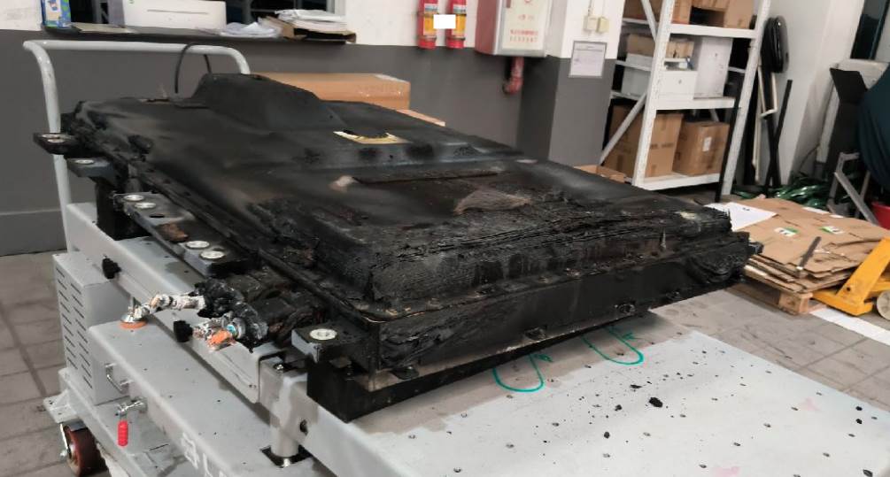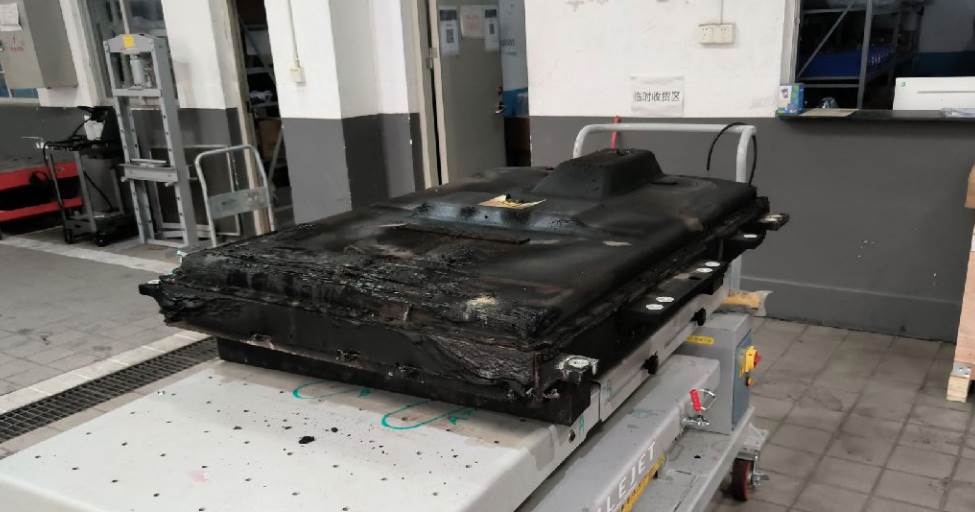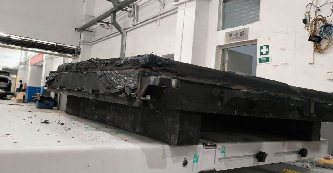 火烧车,电池与车体残骸已分离,电池外壳受损,车体已剩壳体