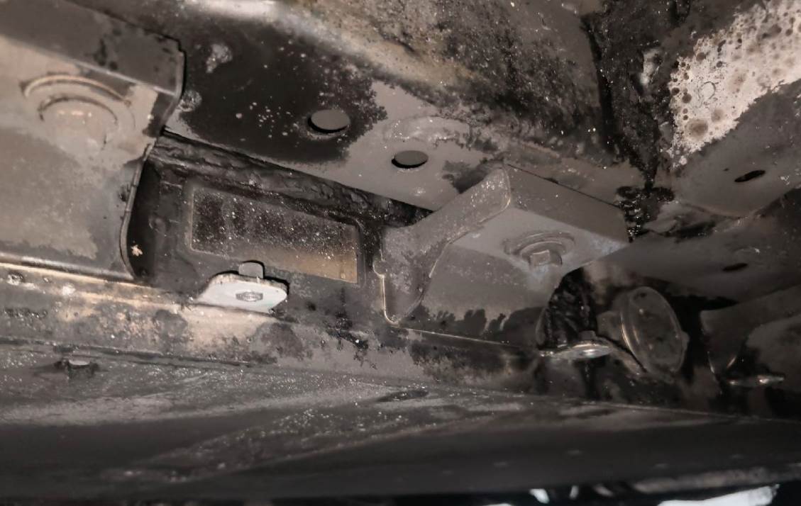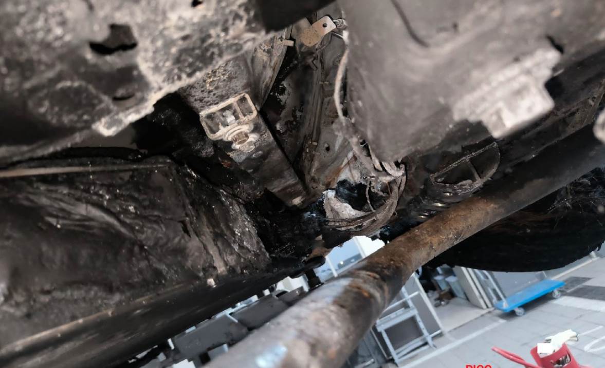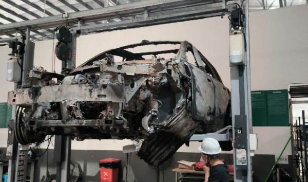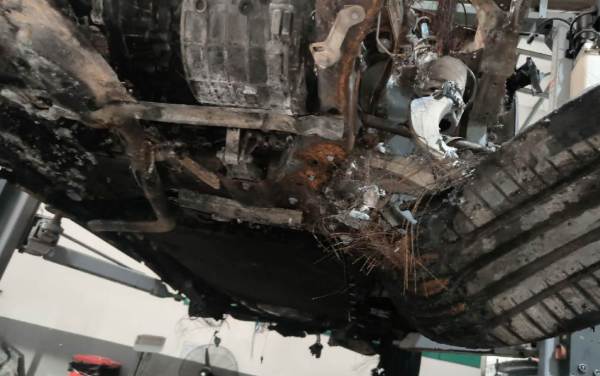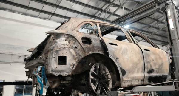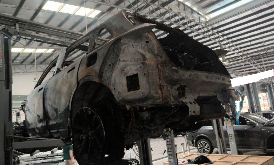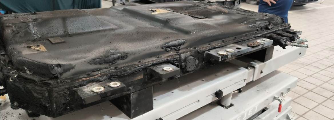 火烧车,电池与车体残骸已分离,电池外壳受损,车体已剩壳体