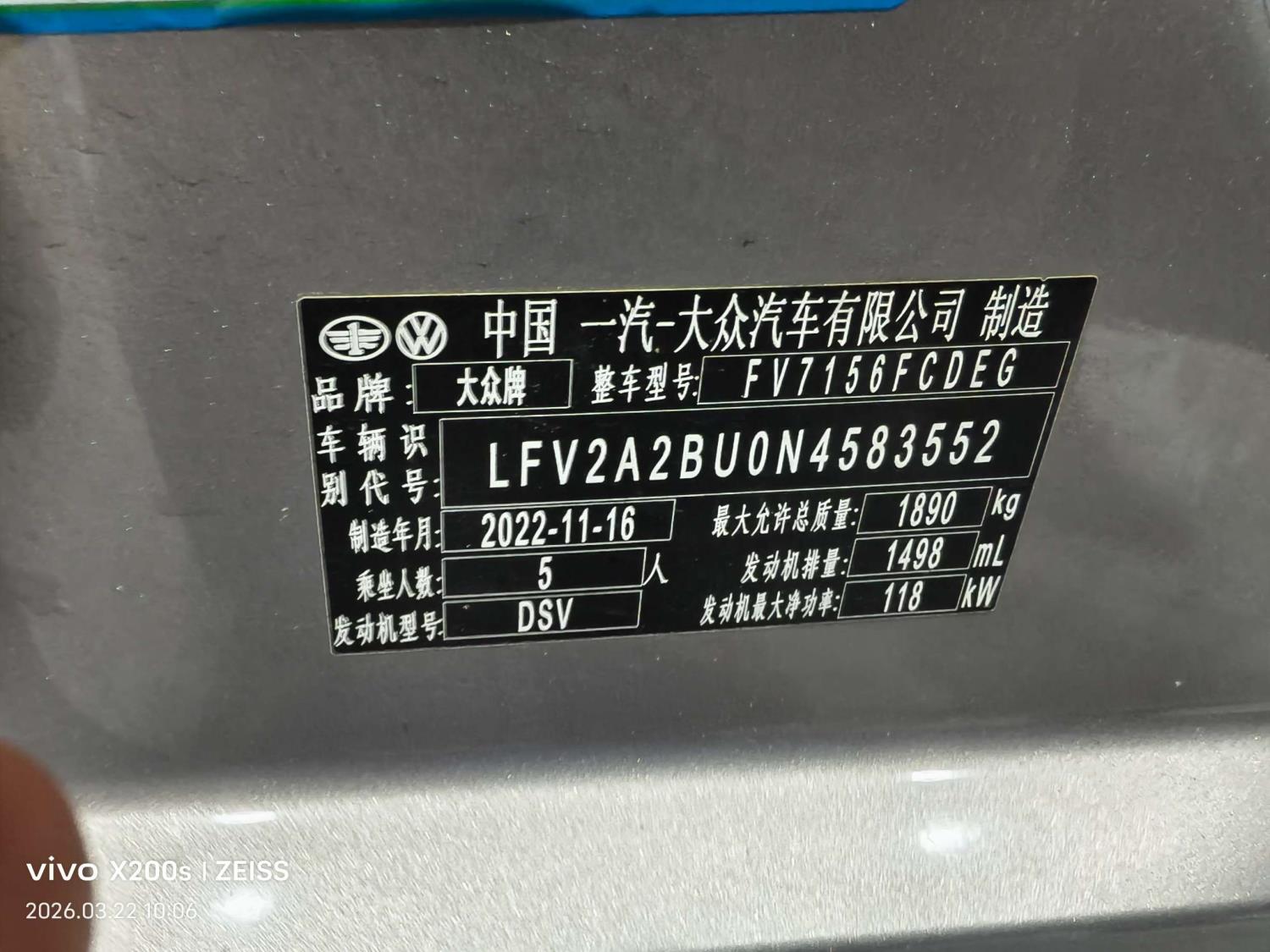 底盘号码 LFV2A2BU0N4583552 变速箱类型 自动