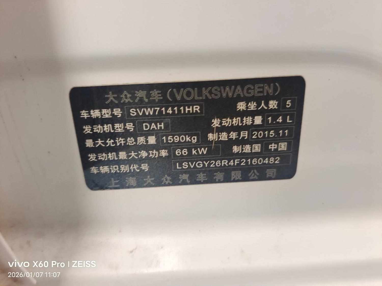 底盘号码 LSVGY26R4F2160482 变速箱类型 手自一体