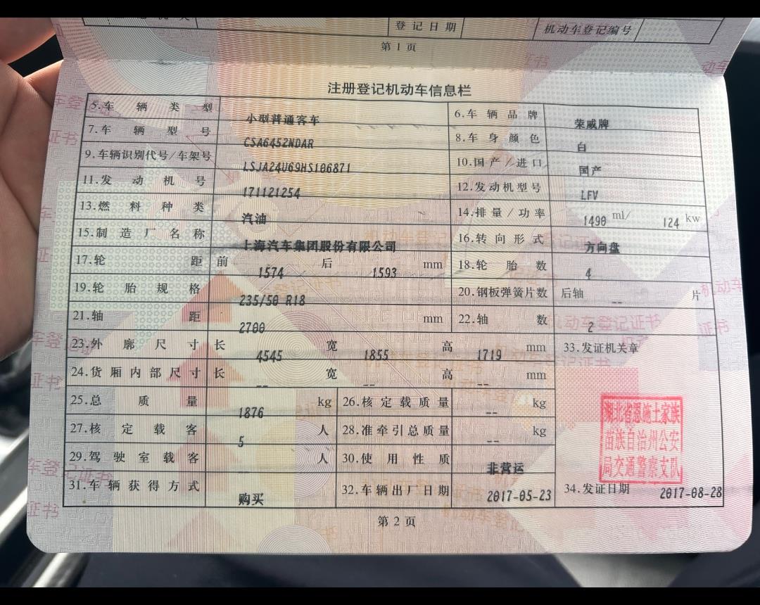 初次登记日期 2017-08-28 车辆名称 荣威RX5