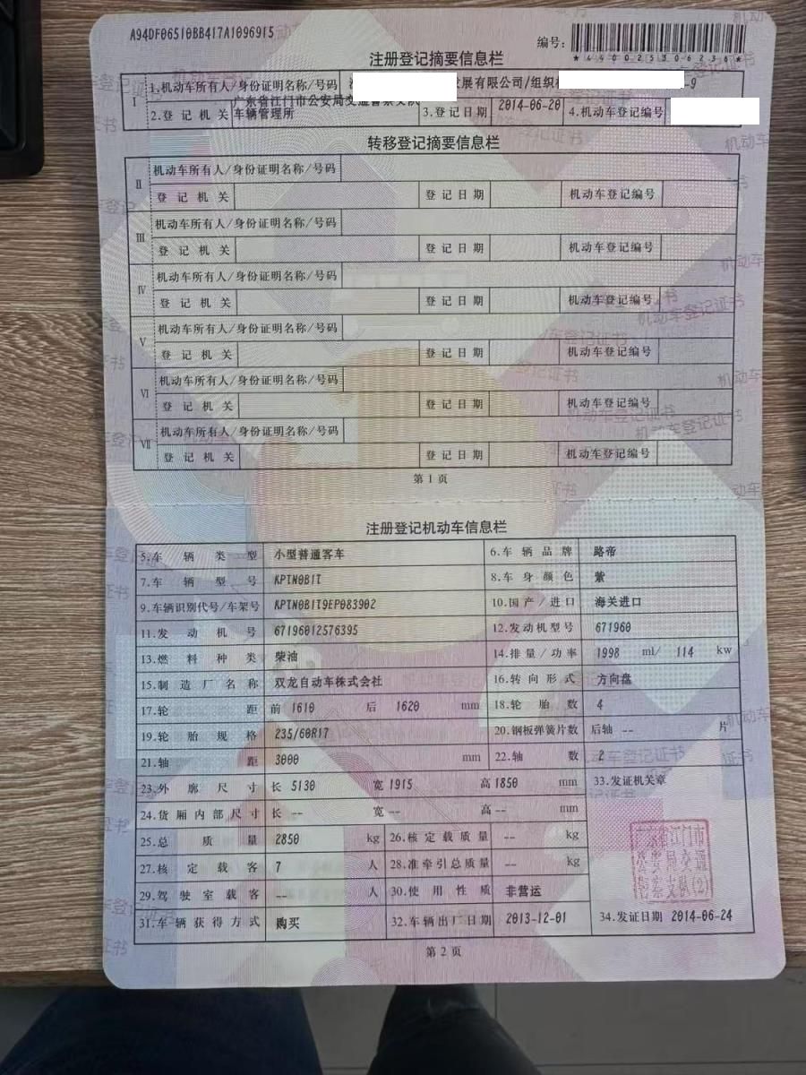 初次登记日期 2014-06-20 车辆名称 双龙 路帝
