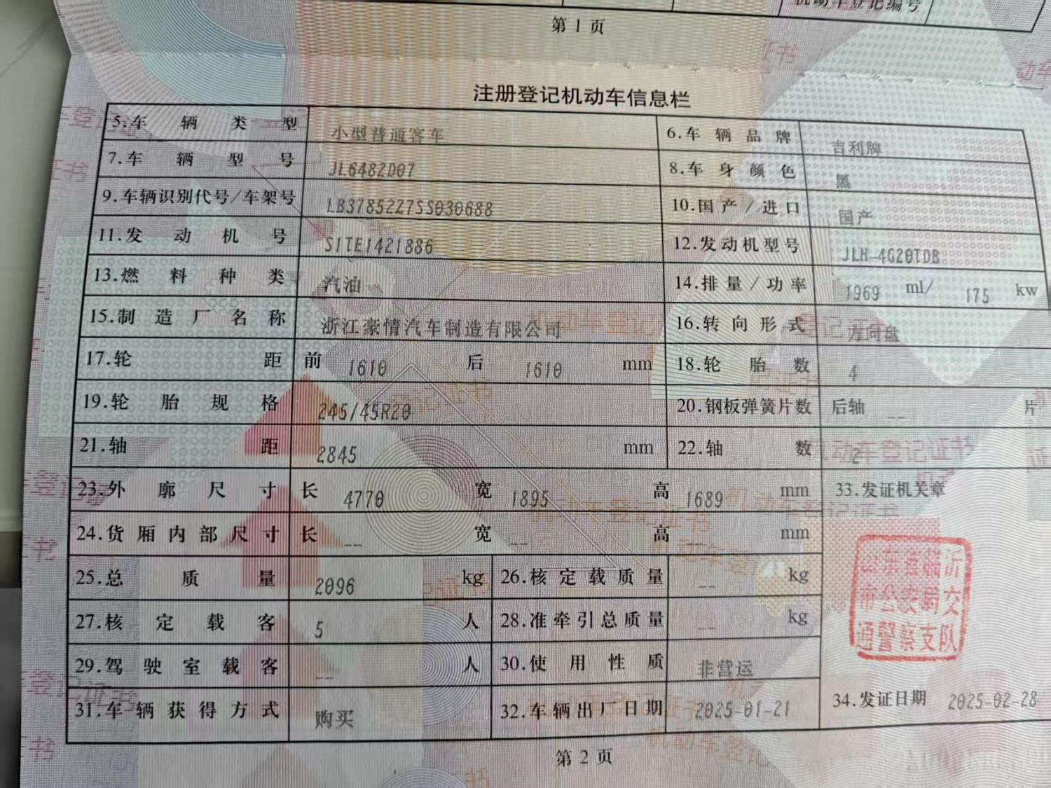 初次登记日期 2025-02-28 车辆名称 吉利汽车