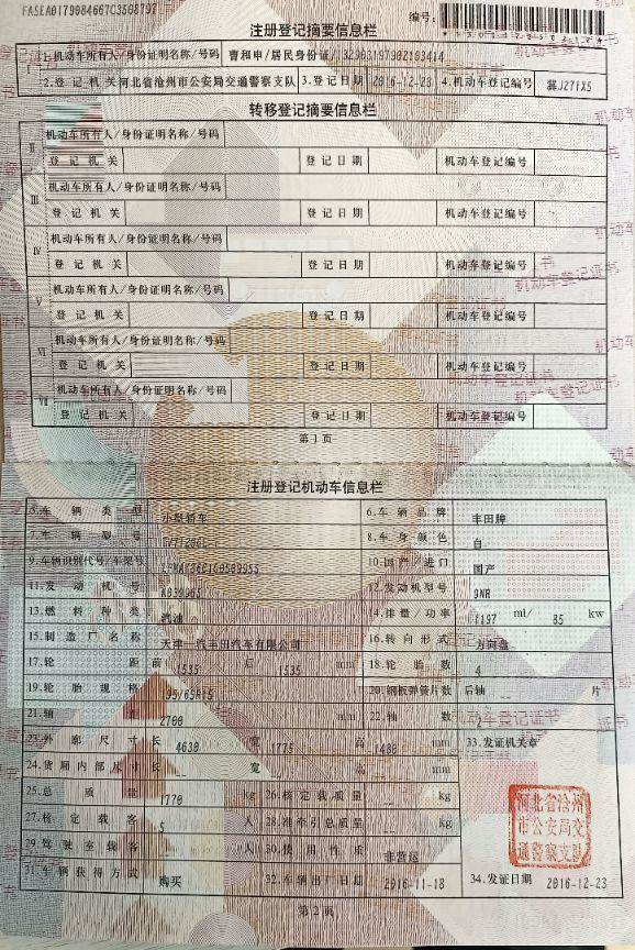 车牌号 冀****** 品牌 丰田