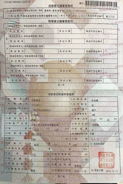 初次登记日期 2016-12-23 车辆名称 丰田 卡罗拉