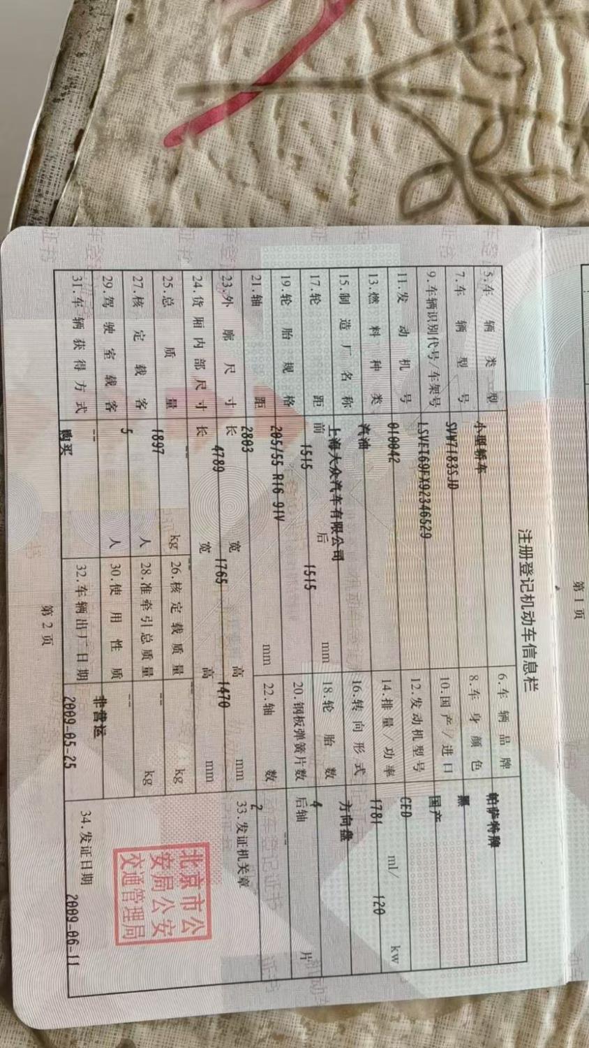 初次登记日期 2009-06-11 车辆名称 大众 Passat领驭
