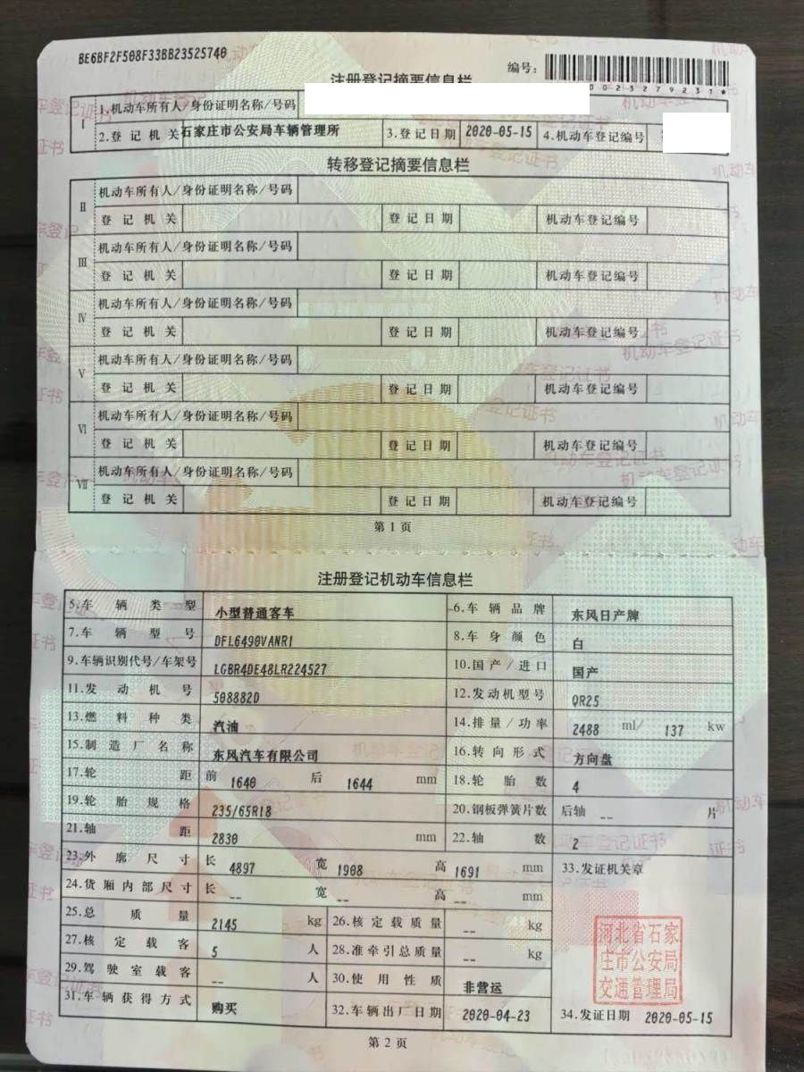 初次登记日期 2020-05-15 车辆名称 日产 楼兰