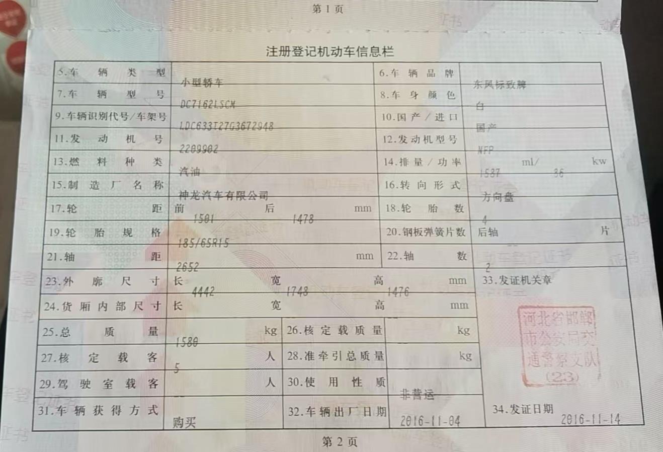车牌号 冀****** 品牌 东风标致
