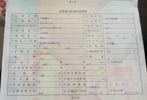 初次登记日期 2016-11-14 车辆名称 标致301