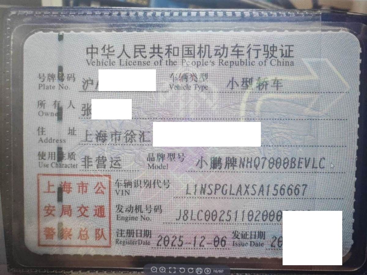 初次登记日期 2025-12-06 车辆名称 小鹏牌