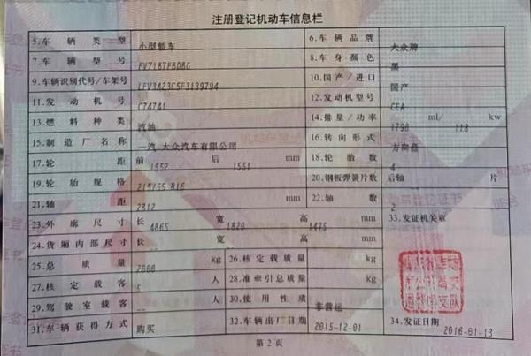 初次登记日期 2016-01-13 车辆名称 大众 迈腾