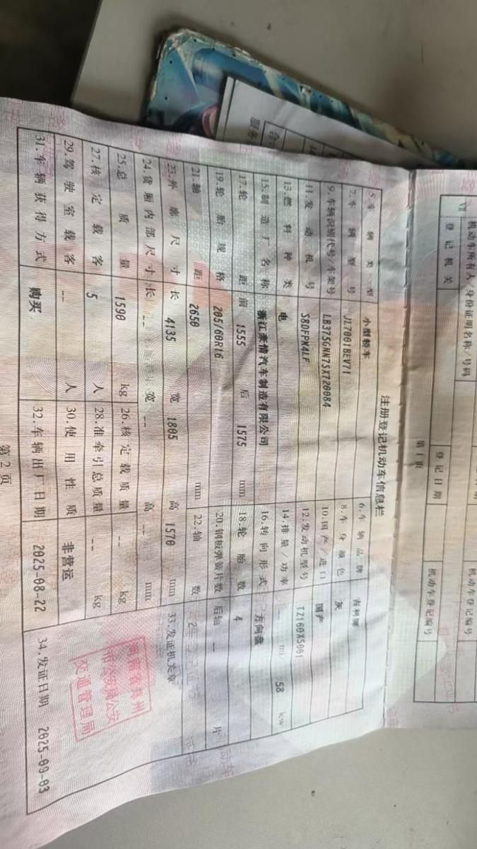 初次登记日期 2025-09-03 车辆名称 吉利银河 星愿
