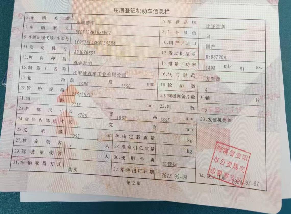 初次登记日期 2024-02-07 车辆名称 比亚迪 秦PLUS