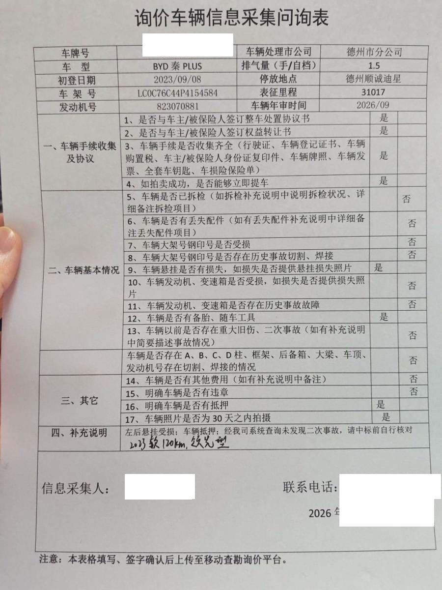 左后悬挂受损;车辆抵押;经我司查询未发现二次事故,请中标前自行核对;车辆2023款120Km冠军版领先型