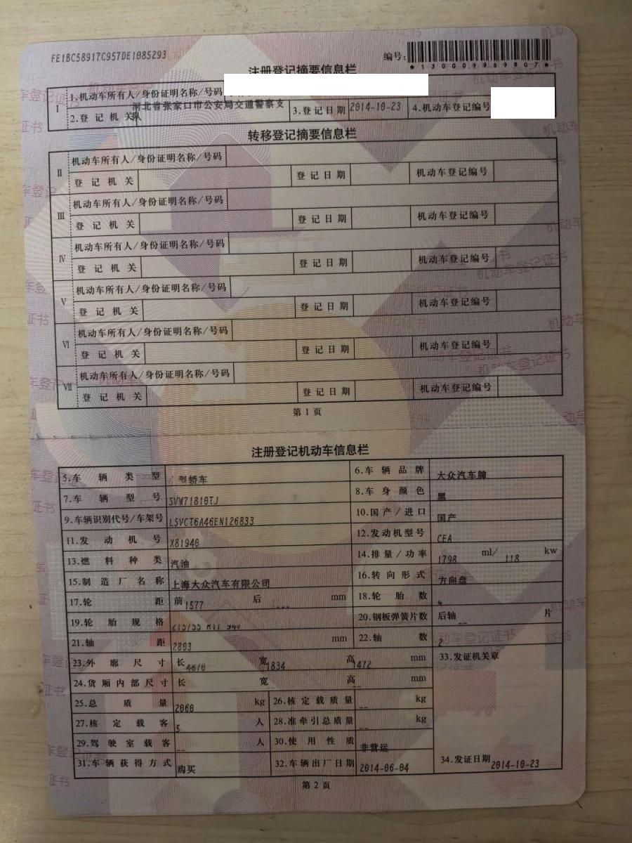 初次登记日期 2014-10-23 车辆名称 大众 帕萨特