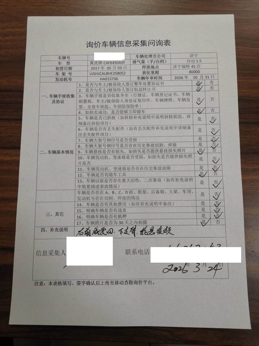 车架号是否受损 未知 使用性质 非营运