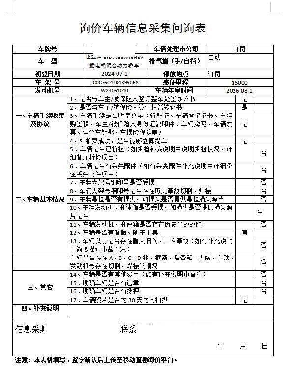 车架号是否受损 未知 使用性质 非营运