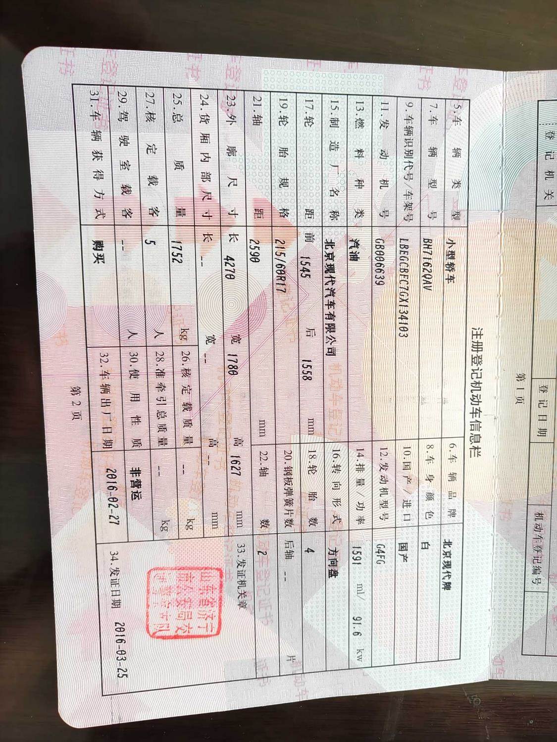 初次登记日期 2016-03-25 车辆名称 北京现代ix25