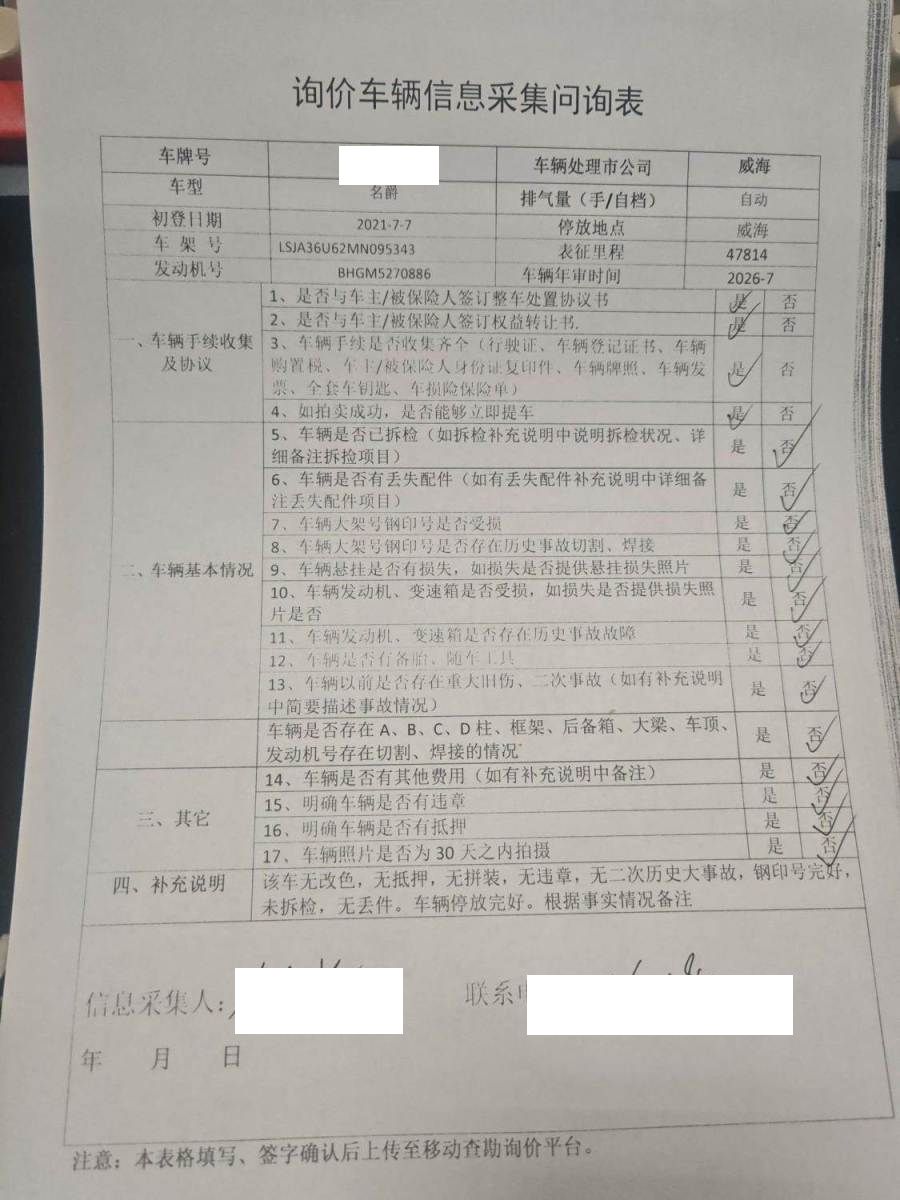 车辆归属地 山东省威海市 车辆停放仓库 山东省威海市