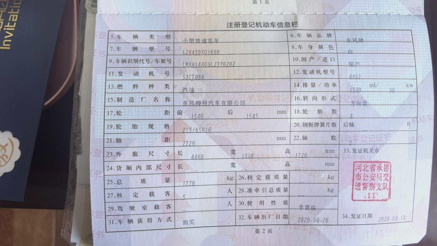 车牌号 冀****** 品牌 东风风行