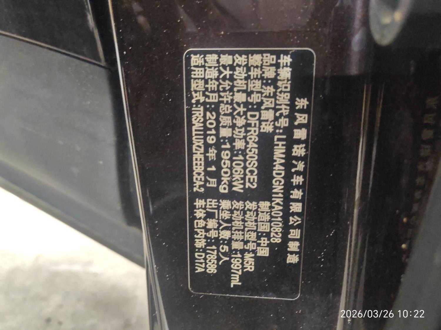 底盘号码 LHMA4DGN1KA010828 变速箱类型 自动