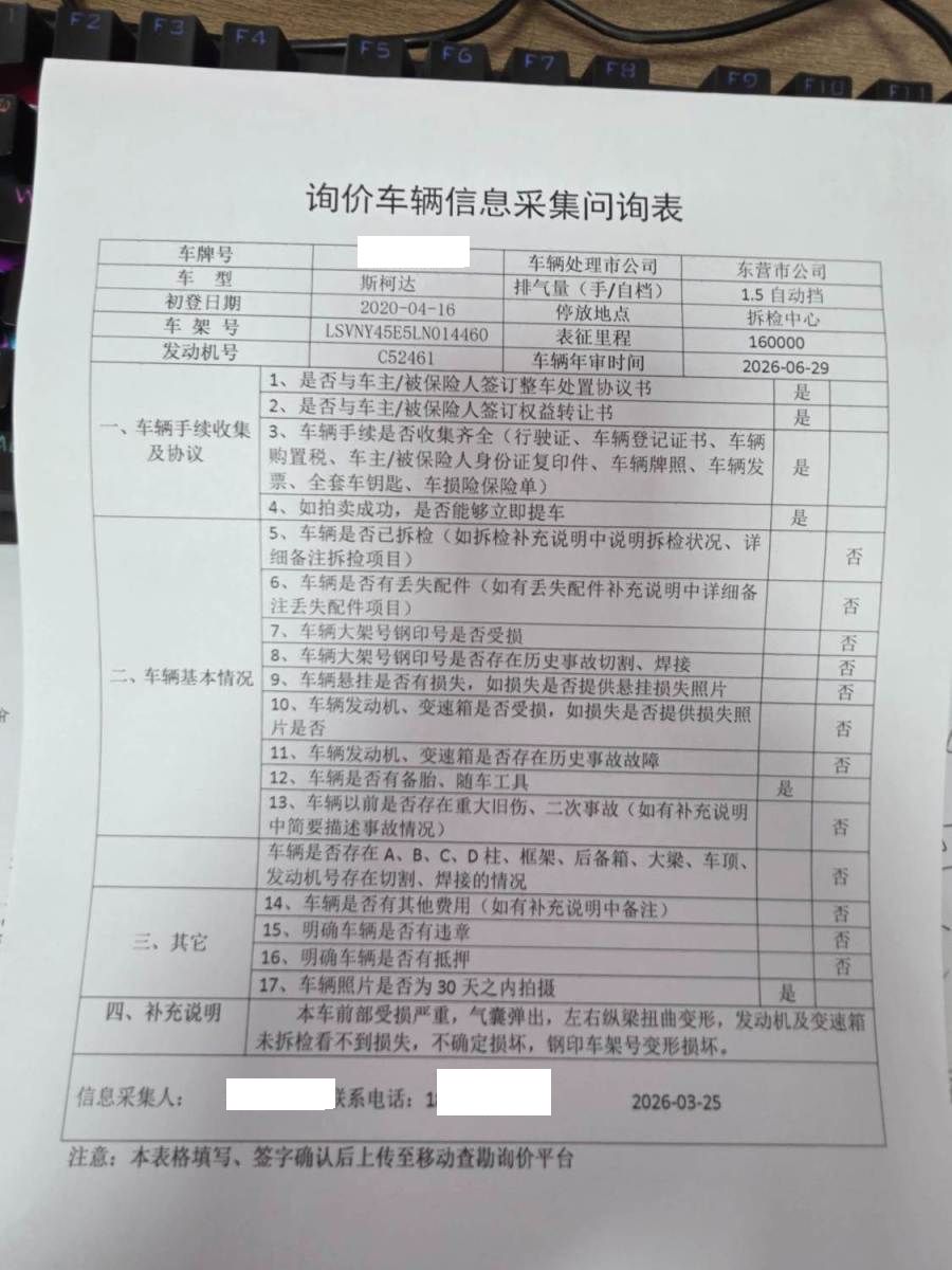 车架号是否受损 未知 使用性质 非营运