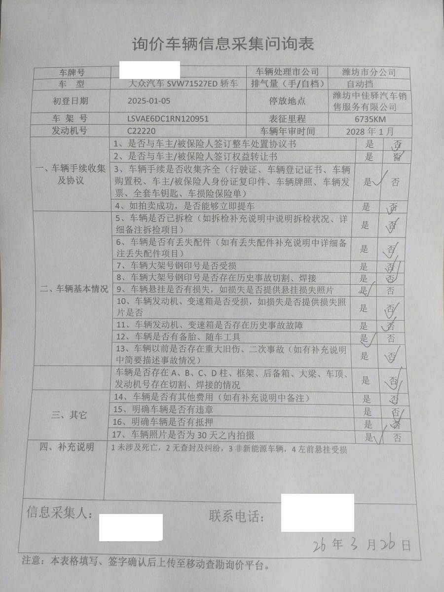 车架号是否受损 未知 使用性质 非营运
