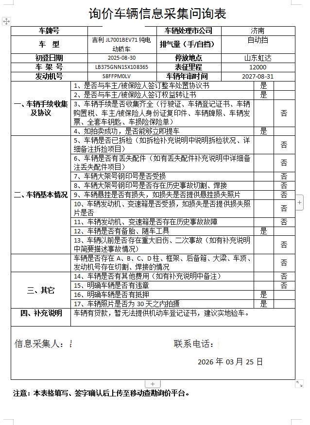 车架号是否受损 未知 使用性质 非营运
