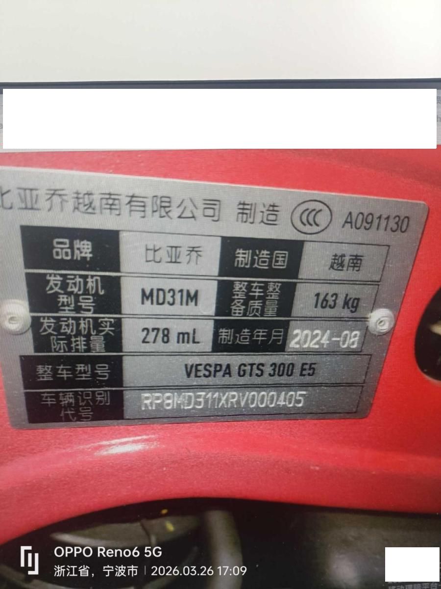 车型:比亚乔 VESPA GTS 300摩托车 二手车交易费发票金额低于拍卖成交金额开具(不含手续费及其他费用) 。