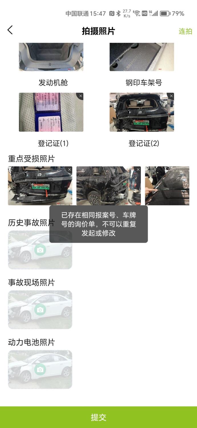 电池租金,山东寻过了,实际车号。车牌号正确录入,系统提示重复,无法提交,截图上传