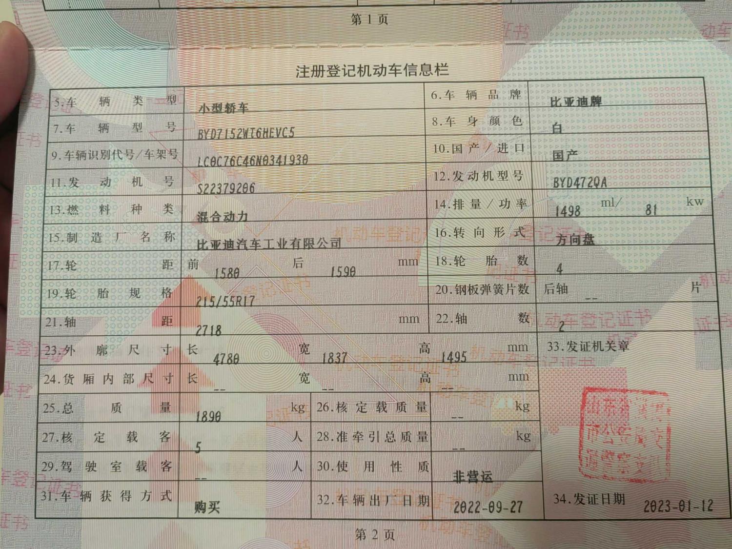 初次登记日期 2023-01-12 车辆名称 比亚迪 驱逐舰
