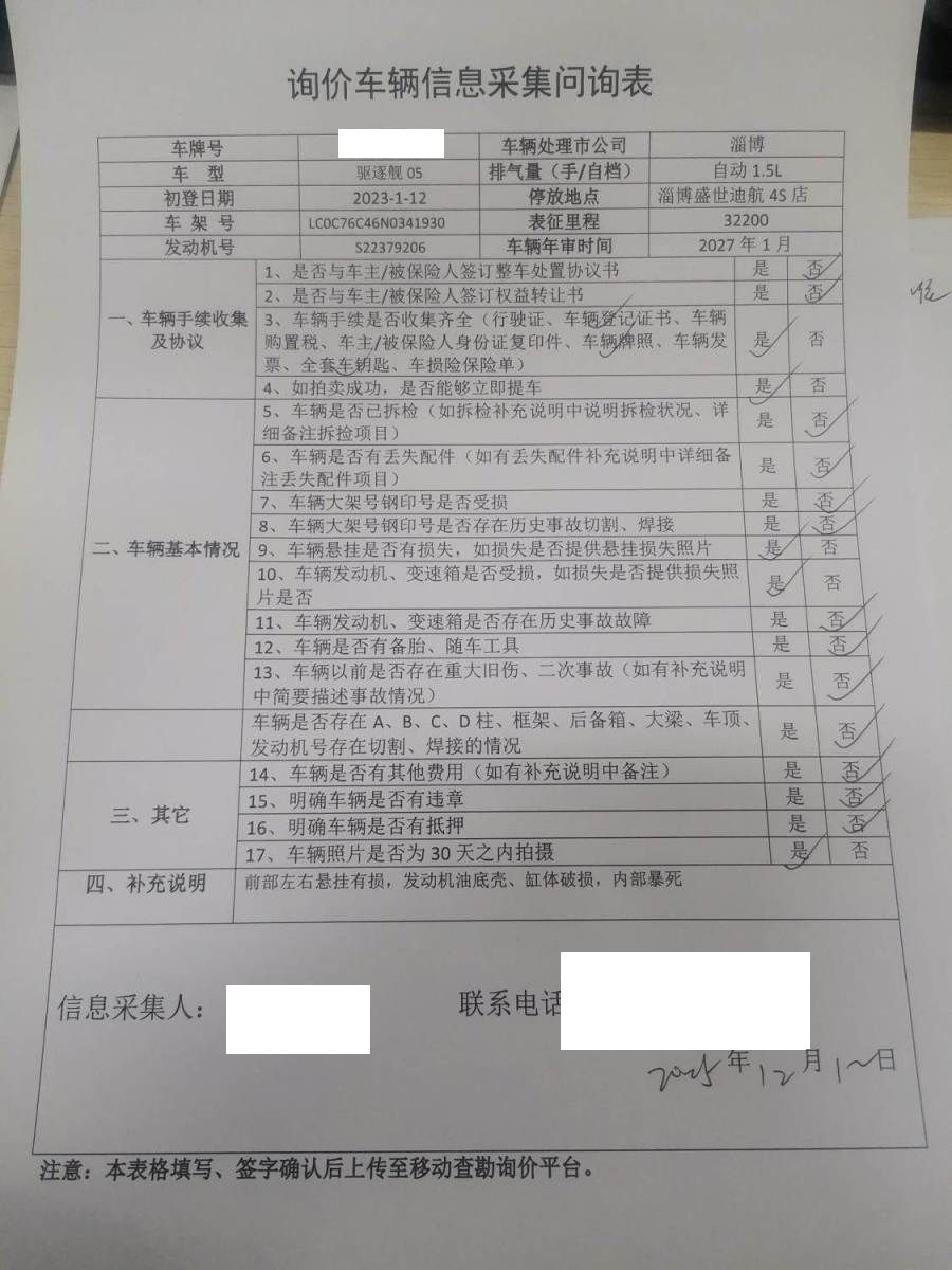 车架号是否受损 未知 使用性质 非营运