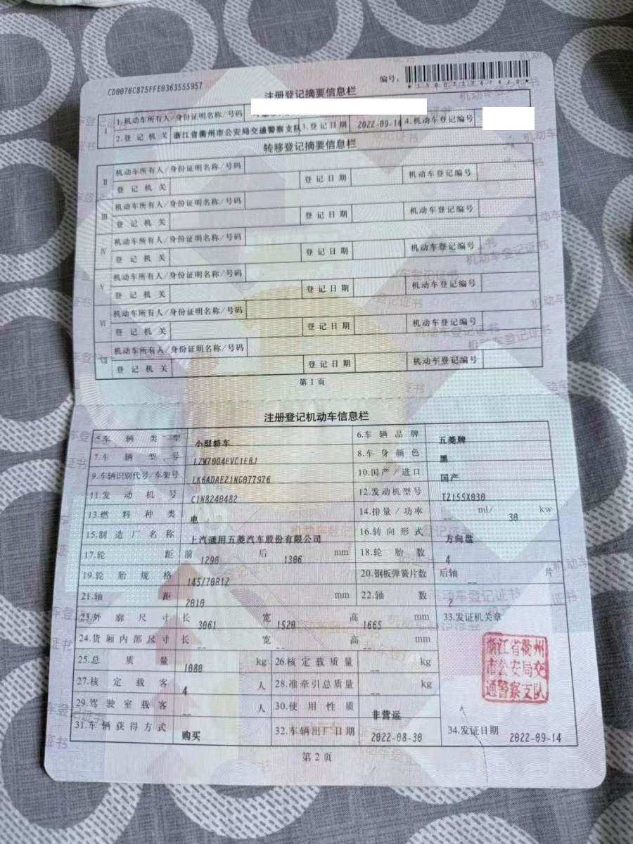 初次登记日期 2022-09-14 车辆名称 五菱汽车 宏光