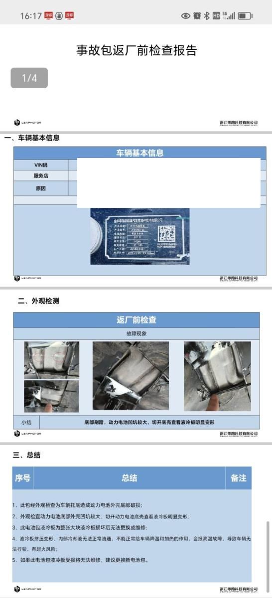 询残,本车发生倾覆拖地事故,造成左侧外观及底盘受损,前杠部位简单拆解,电池拆解后经返厂检测后需更换电池总成,检测报告已上传系统