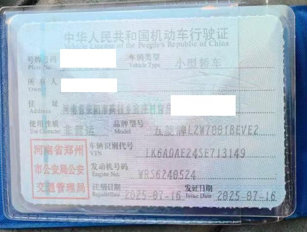初次登记日期 2025-07-16 车辆名称 五菱汽车 五菱之光