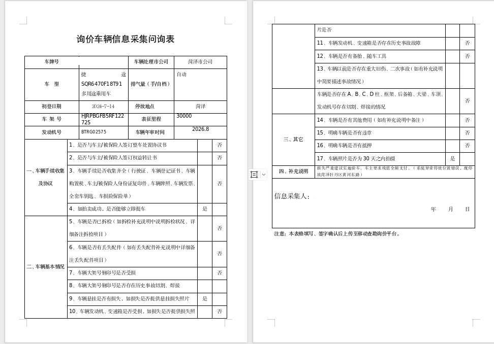 车架号是否受损 未知 使用性质 非营运