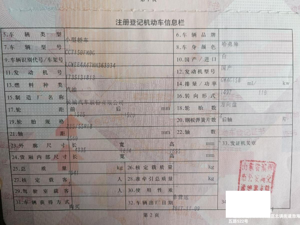 初次登记日期 2017-11-09 车辆名称 哈弗H2