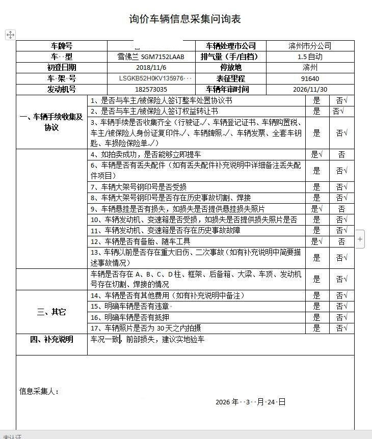 车辆归属地 山东省滨州市 车辆停放仓库 山东省滨州市