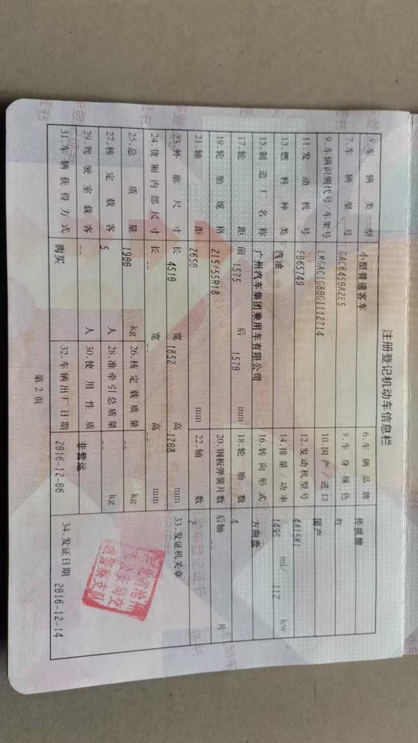 初次登记日期 2016-12-14 车辆名称 广汽传祺 传祺GS4